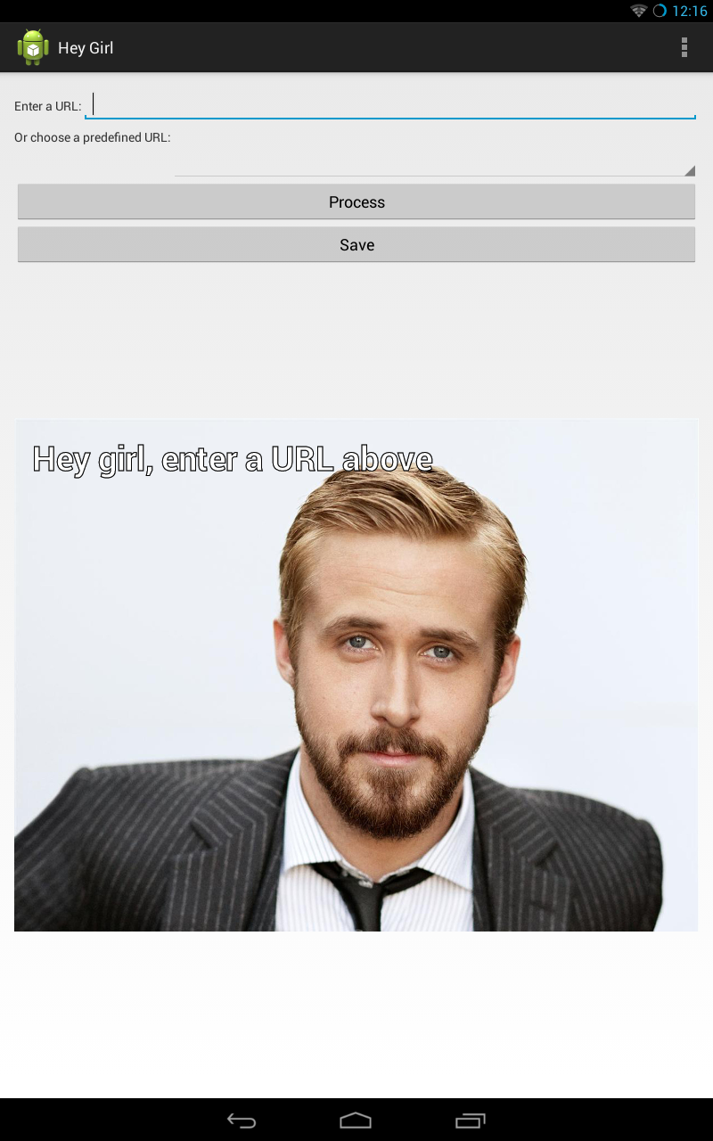 OK, so the basics of taking any given URL and extracting out a place name were taken care of. I then proceeded to build my Android app that would generate memes. Now, I will be the first to admit that generating Android UIs is not exactly my specialty. Nonetheless, I managed to come up with something that I thought looked halfway decent. The end result is not terribly useful, but then, I guess most meme generators aren’t really meant to be useful, they are just meant to entertain, right? For the memes themselves, I simply mapped a place name to a previously defined phrase to be used for that place.